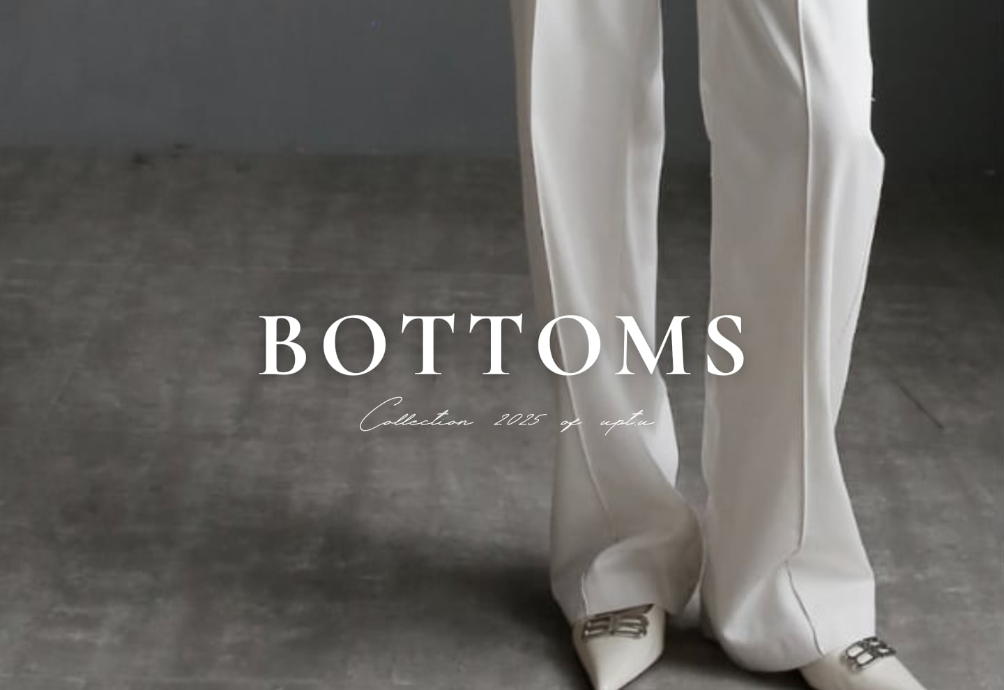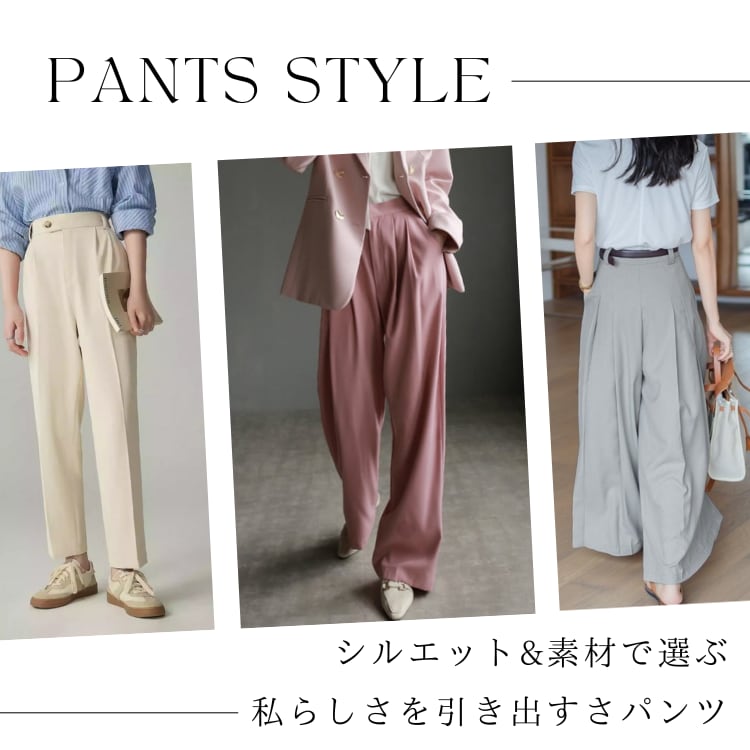 シルエットと素材の組み合わせで表情を変える、パンツスタイルをお楽しみください。