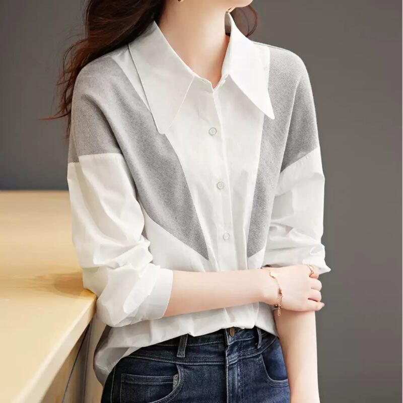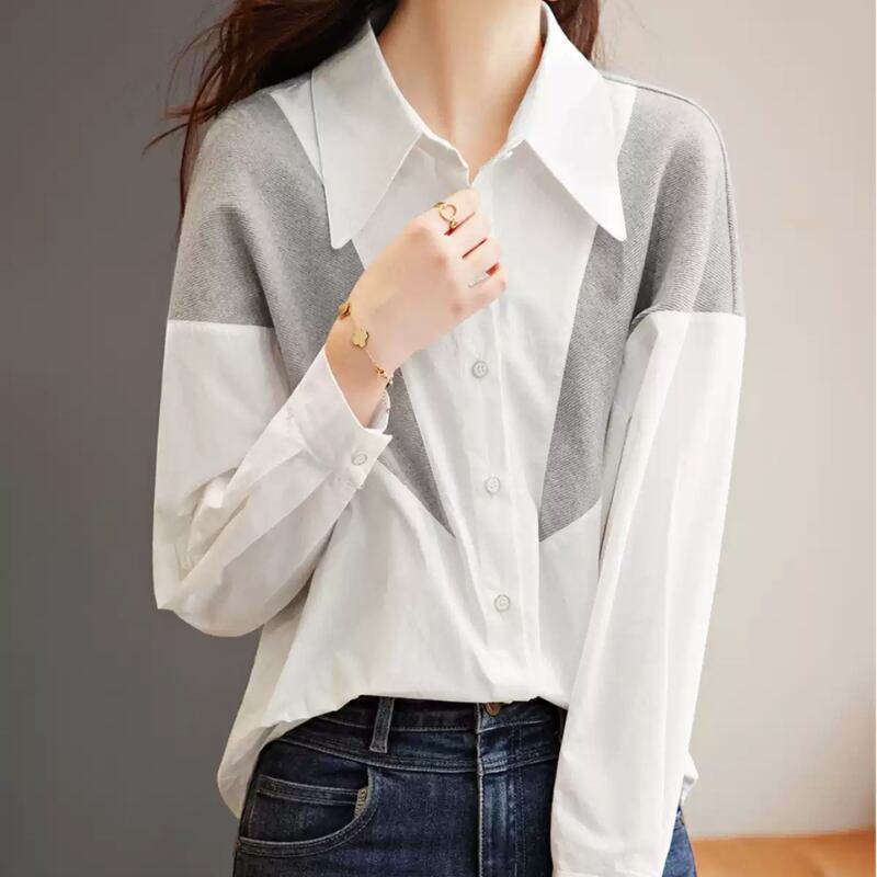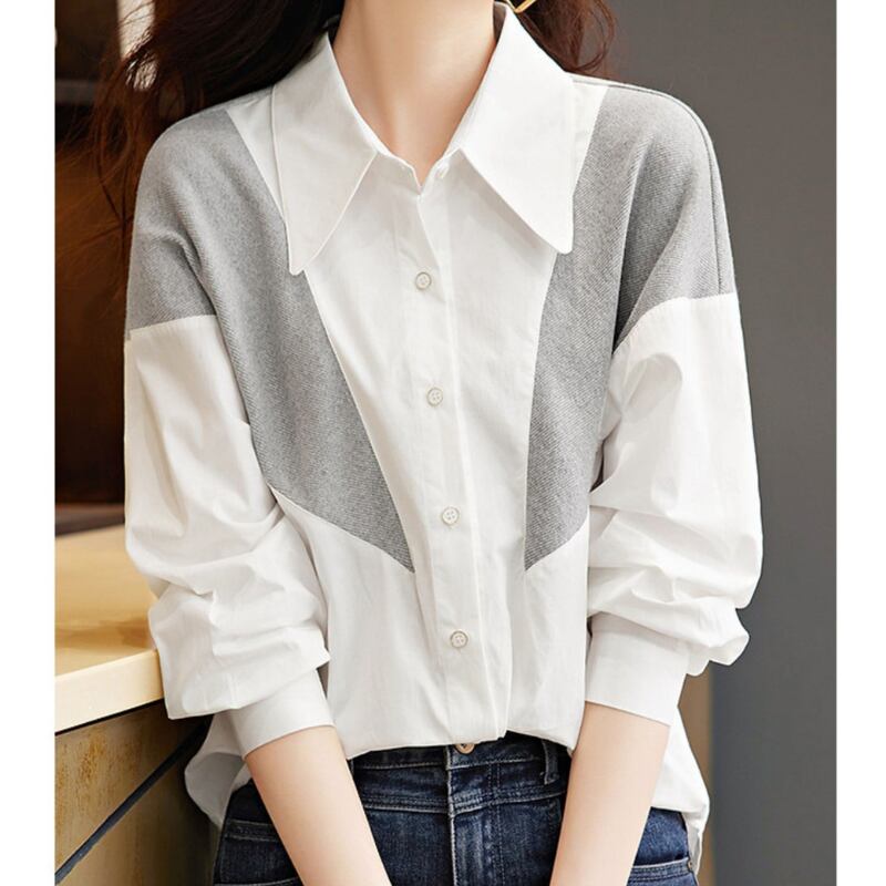 白とグレーの組み合わせが上品なカラーブロックデザインのロングスリーブシャツ。