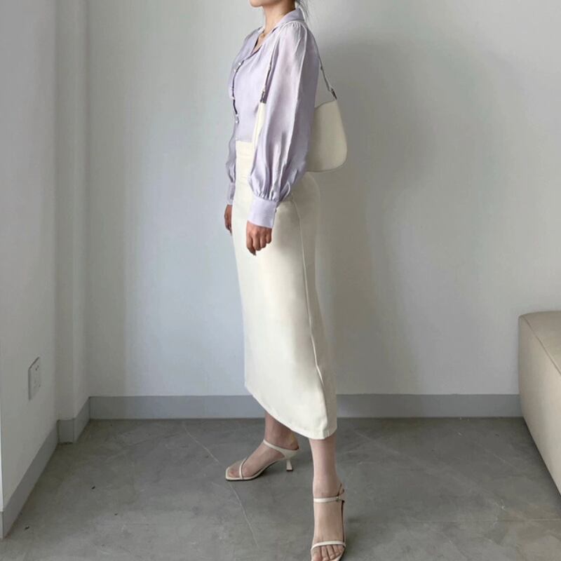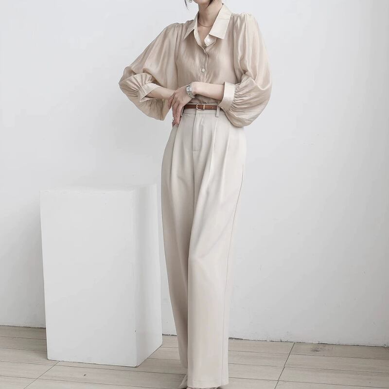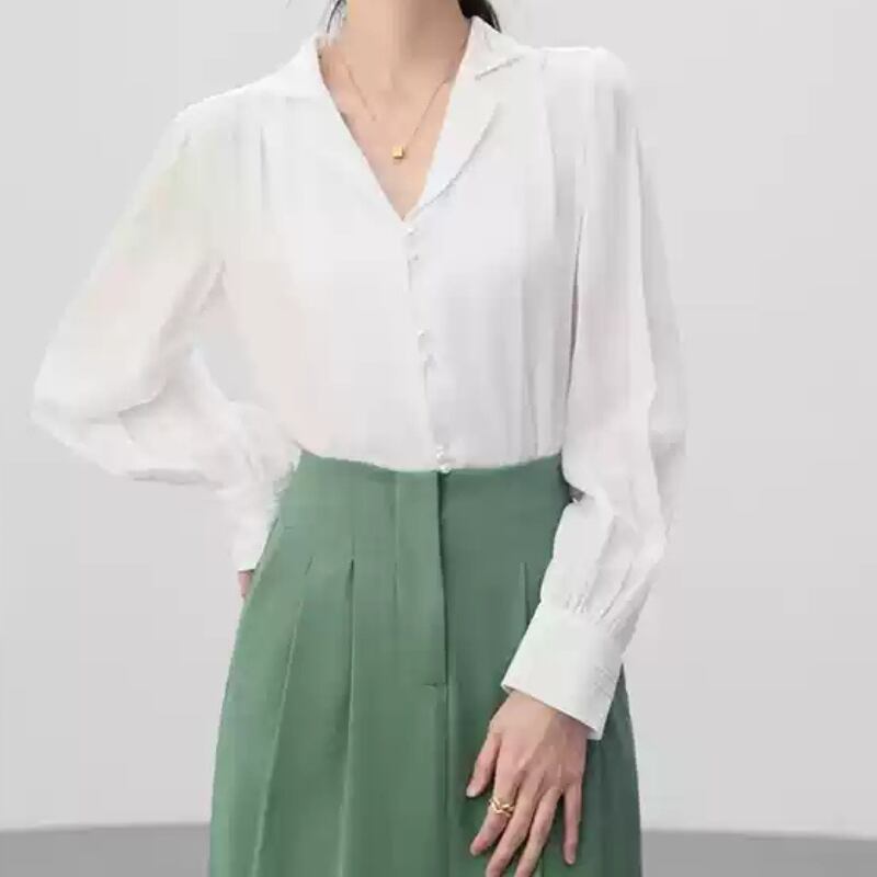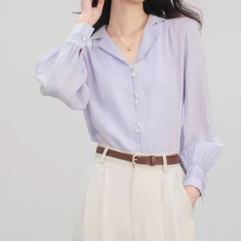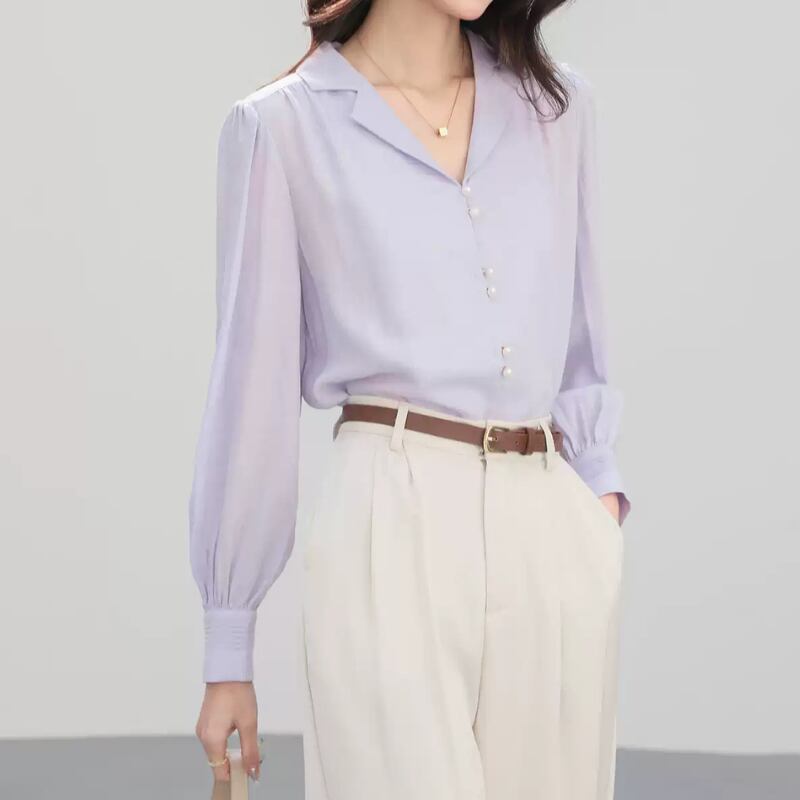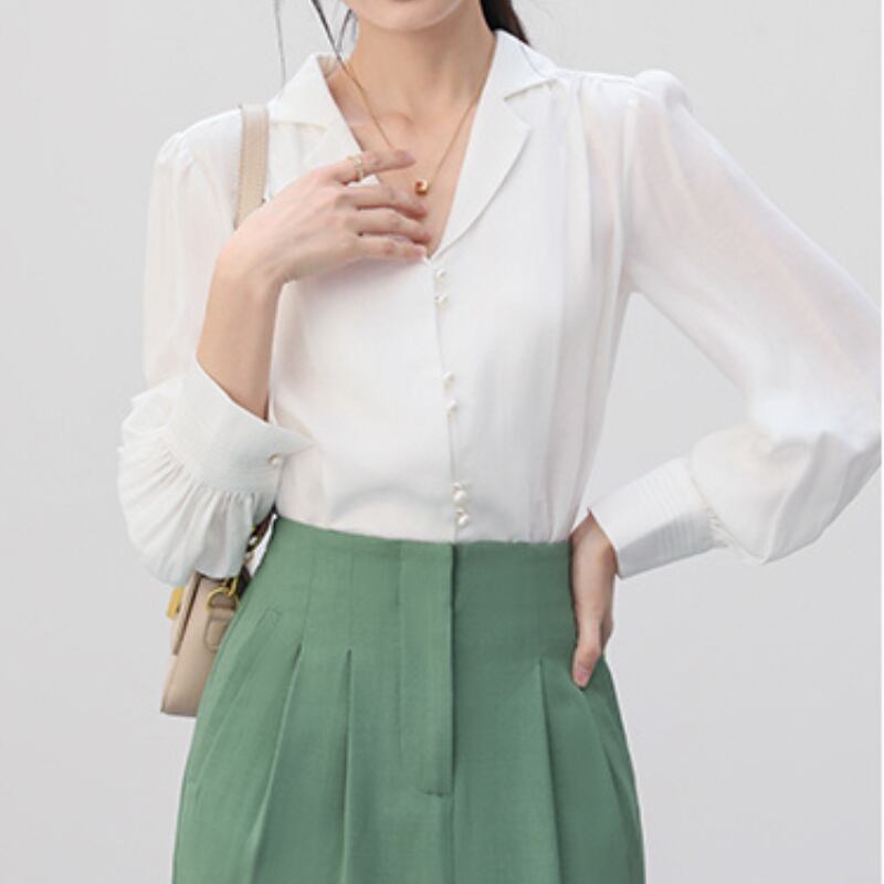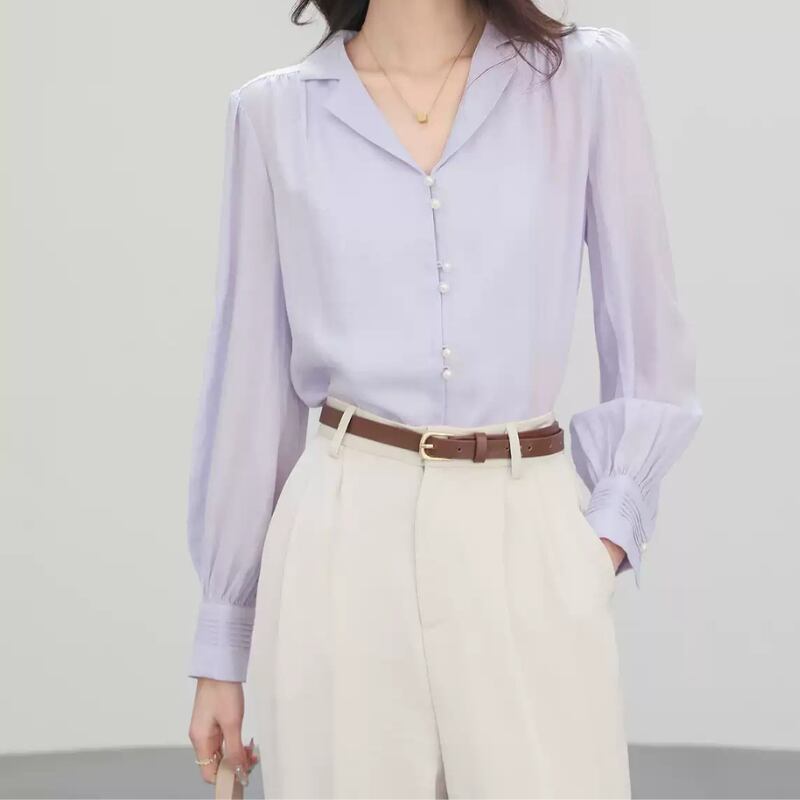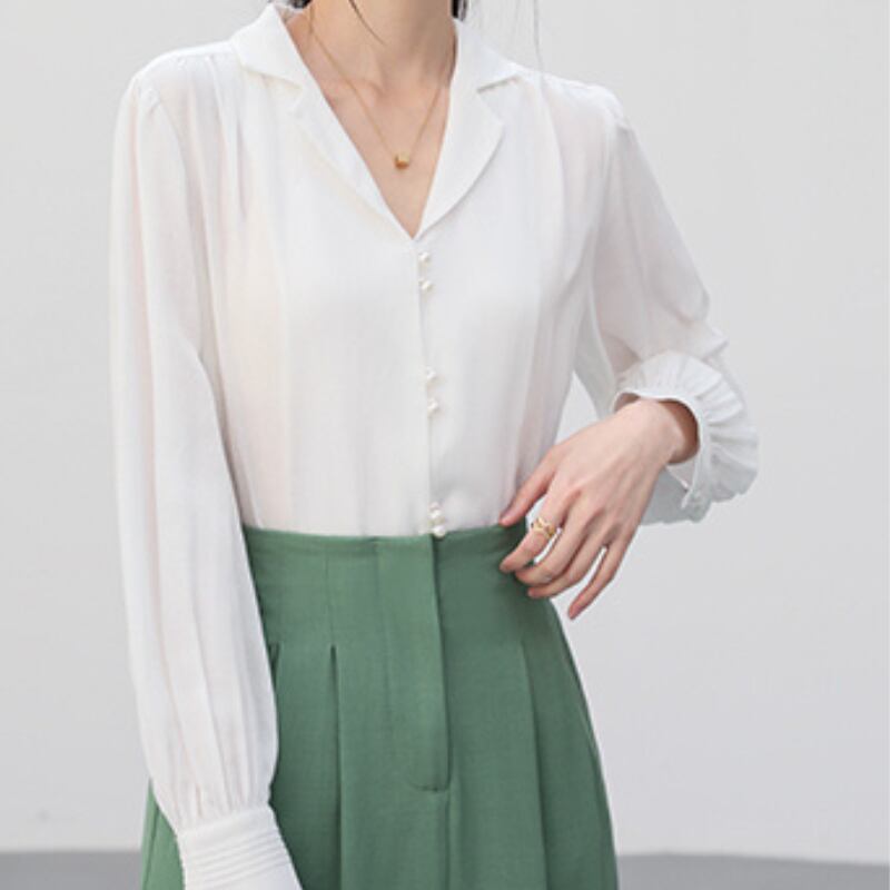 Vネックとバルーンスリーブが女性らしく、2つずつまとまったパールボタンが上品さをプラス。