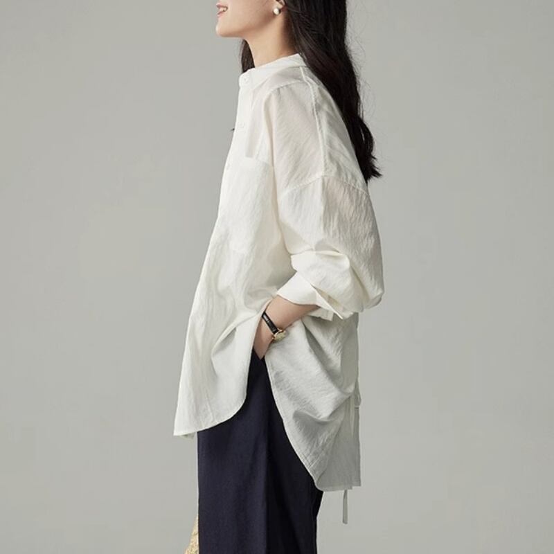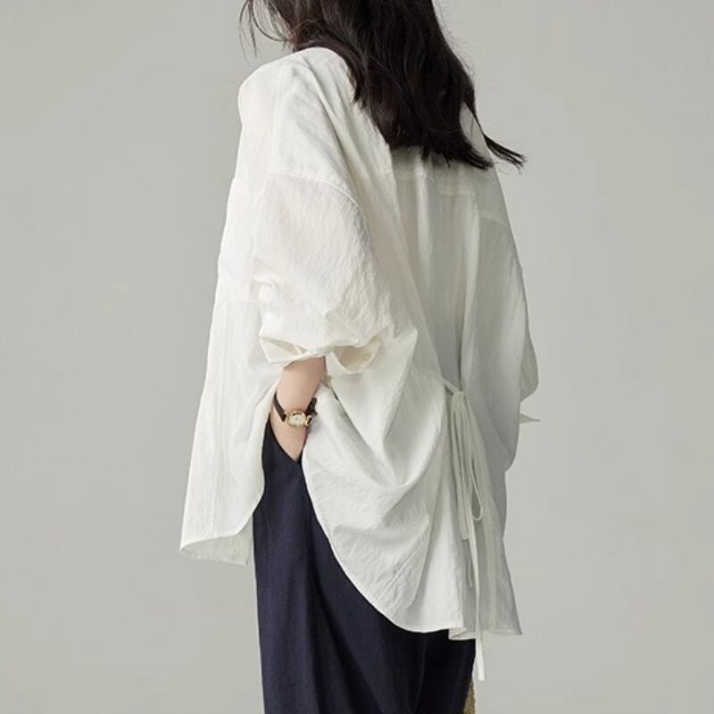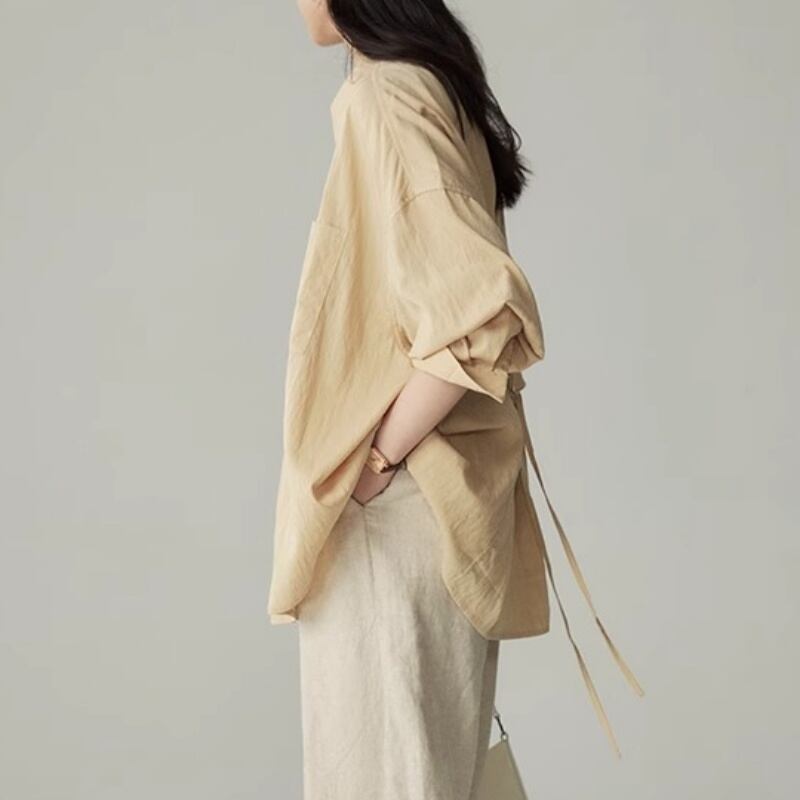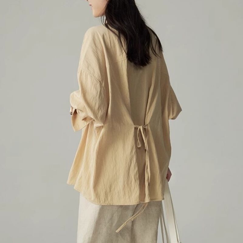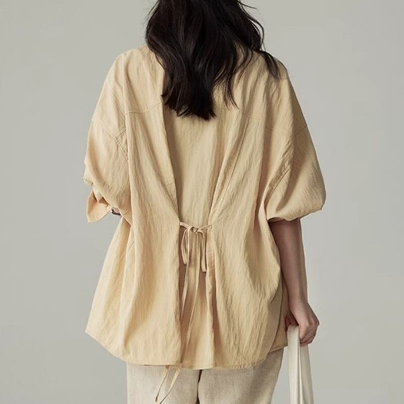 バックリボンがアクセントのプルオーバーシャツ。Aラインシルエットで、体型カバーも叶えつつ女性らしい着こなしが楽しめます。