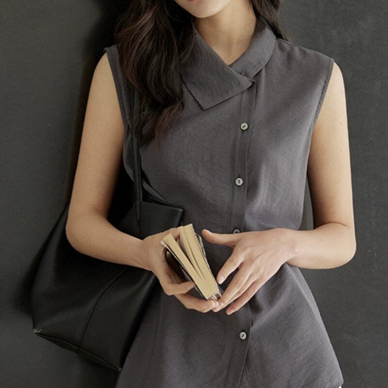 Aラインシルエットが女性らしいノースリーブシャツ。