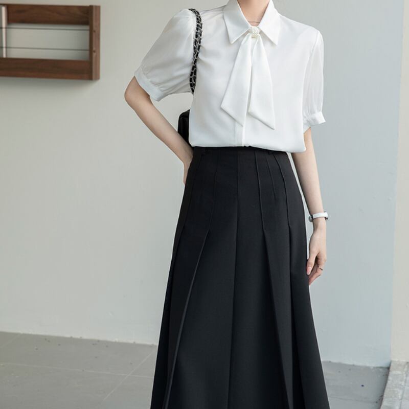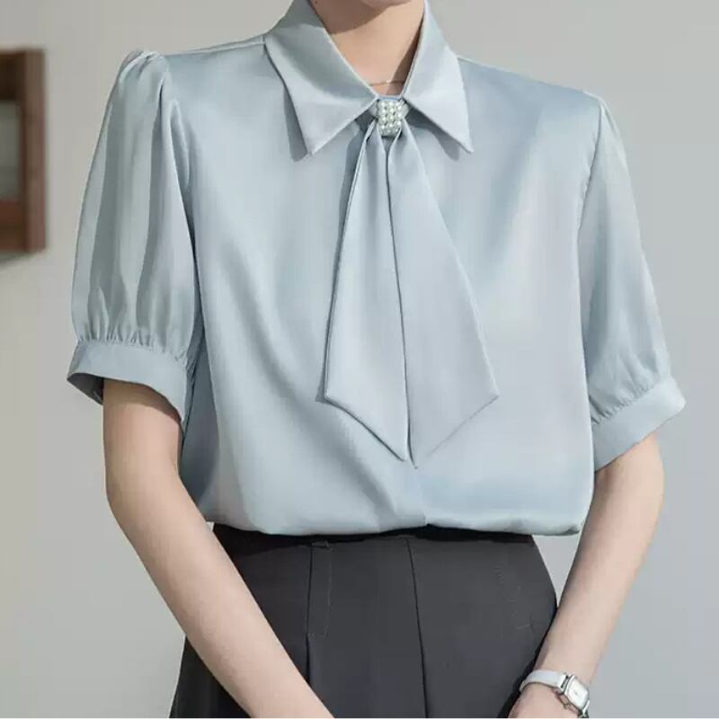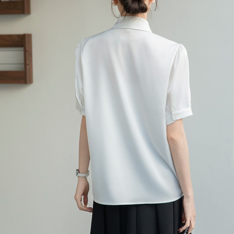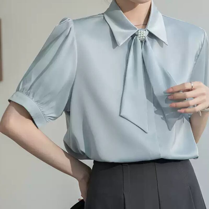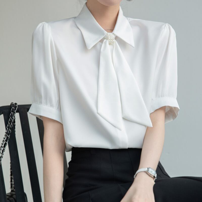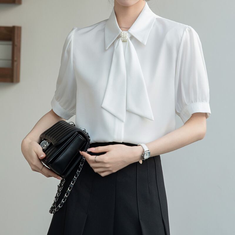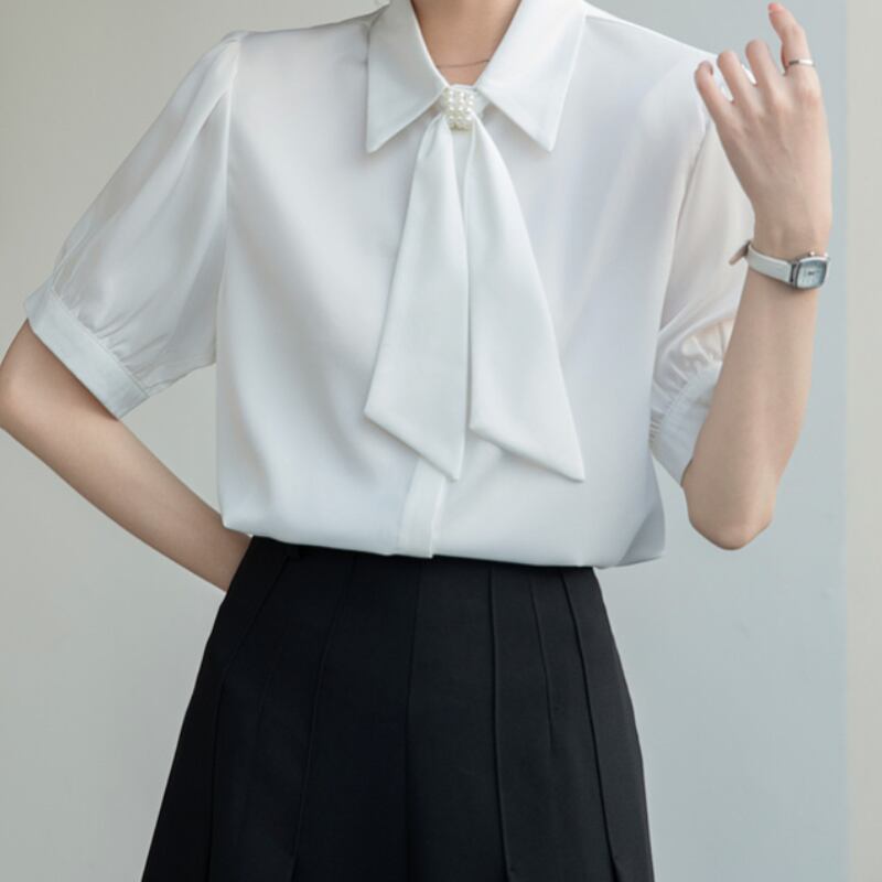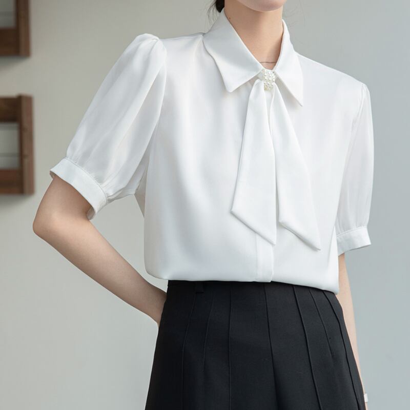 パール付きボウタイがポイントの半袖ブラウス。加えてパフスリーブが上品さを演出します。