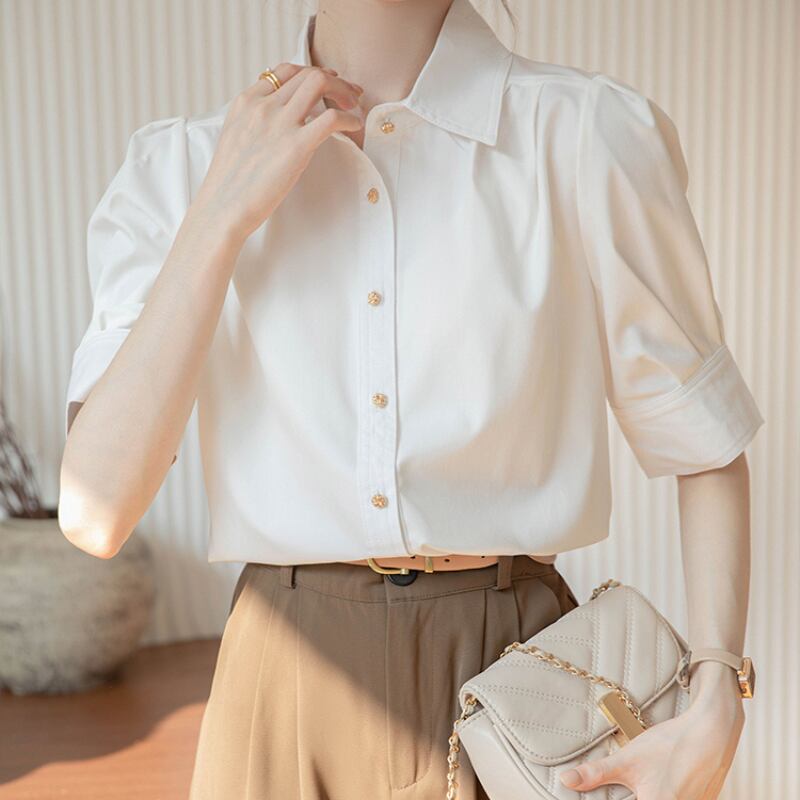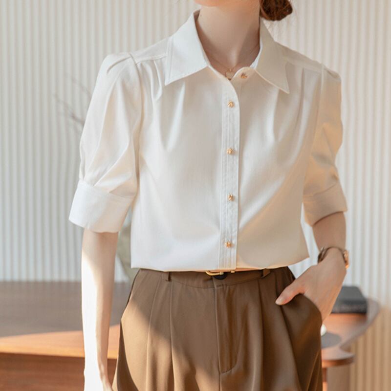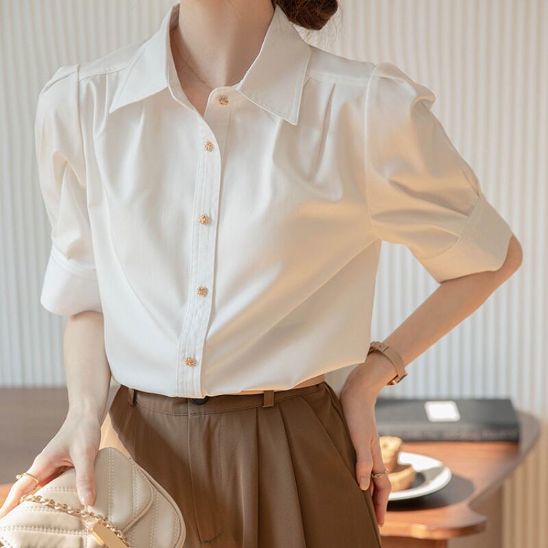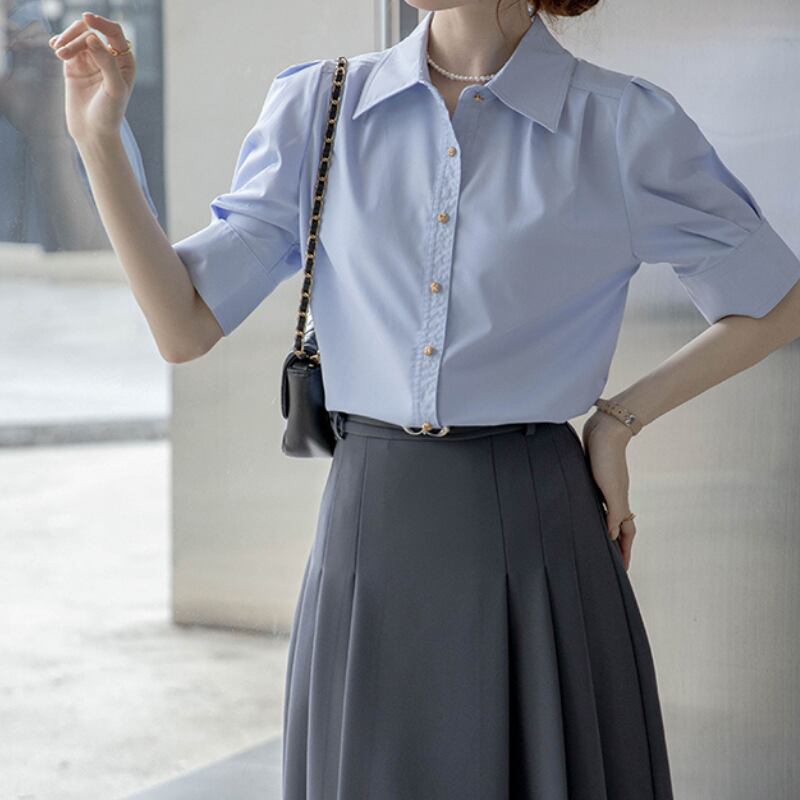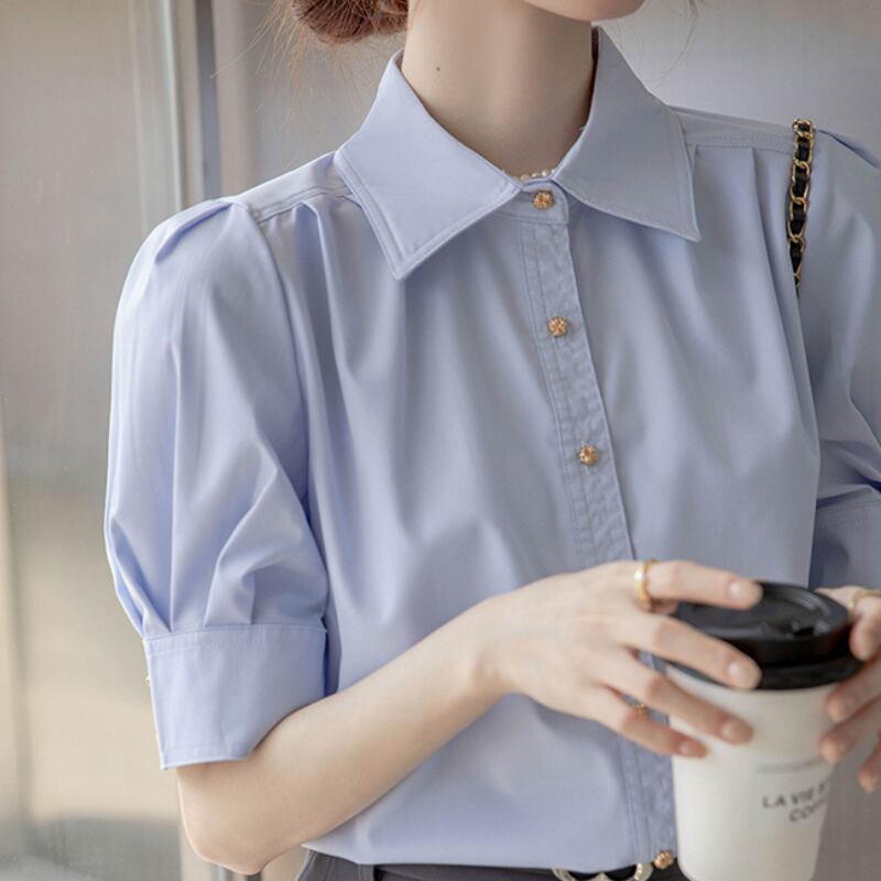 パフスリーブとボタンダウンの組み合わせが絶妙なバランスのシャツ。