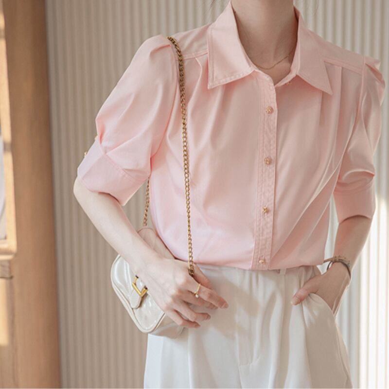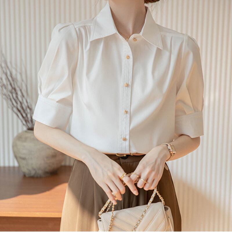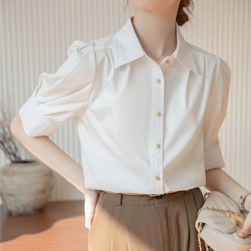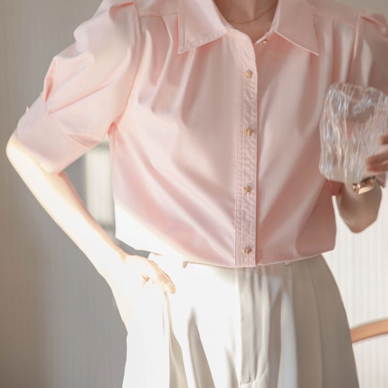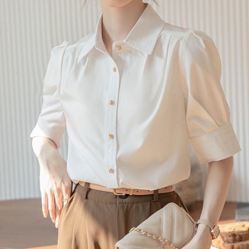 パフスリーブとボタンダウンの組み合わせが絶妙なバランスのシャツ。