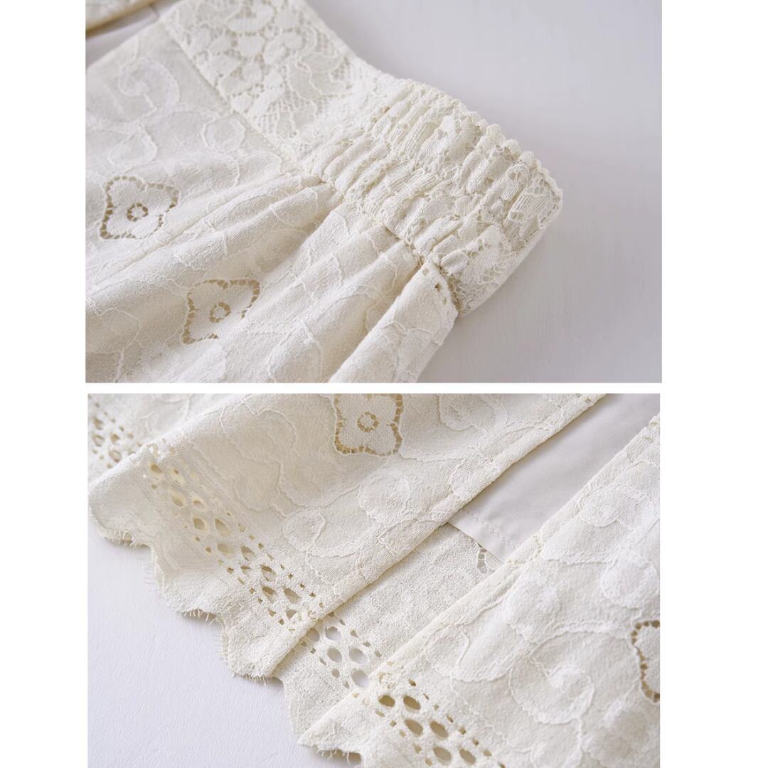 繊細なレースが上品な印象を与え、女性らしいシルエットを演出します。