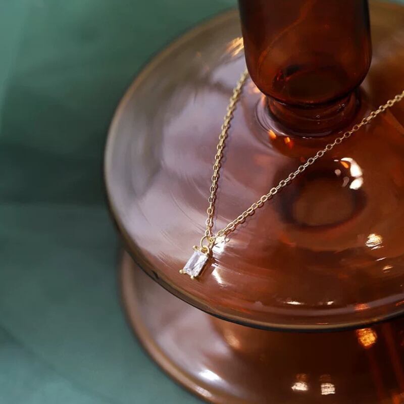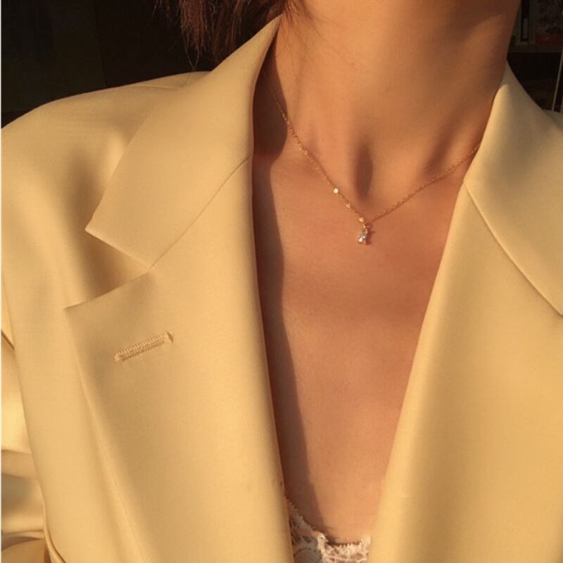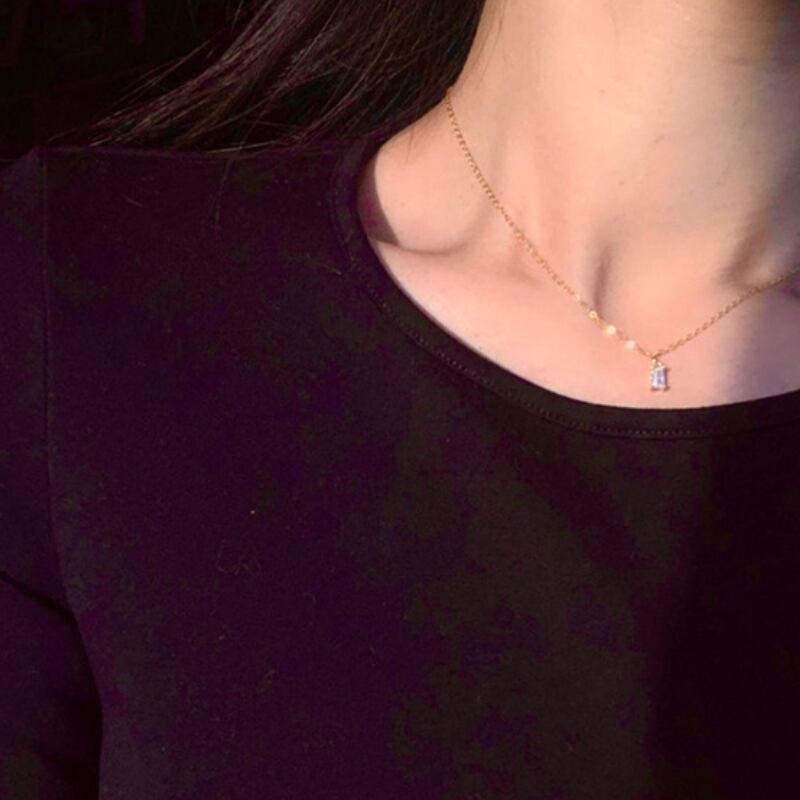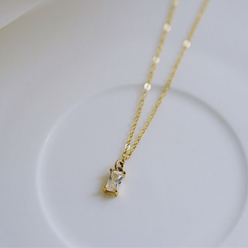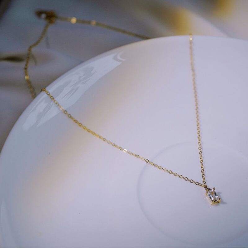 繊細な細チェーンとドロップ型のペンダントが、さりげない輝きを放ちます。